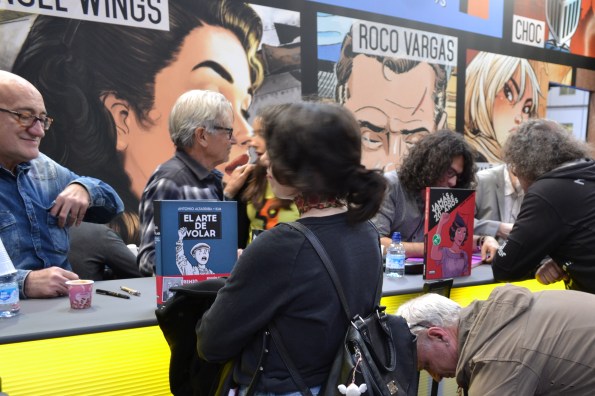 A estos nombres es obligado añadir los de un gran número de autores nacionales que han contribuido activamente al éxito del certamen. Clásicos como Kim y Altarriba, que prosiguieron dedicando su exitoso díptico El arte de volar/El ala rota; Josep María Beà, que tuvo que tomarse un respiro de tanto dibujar y dedicar su radiante nueva edición de Historias de la taberna galáctica y el tomo recopilatorio El hombre de los mil estilos, editados ambos (y muy bien) por Trilita Ediciones. O el siempre animado stand de Astiberri que contó, como es habitual, con Paco Roca, uno de los más queridos ilustradores, que dibujó y dedicó a buen ritmo a todo el que se acercó, portando el curioso estuche porta lápices que siempre lleva a estos eventos: una caja del VHS de la película ‘Jesucristo Superstar.’ O también el imprescindible Pedro Vera, que llegó un poco apurado a la cita con su fiel parroquia de seguidores, ¡efectiviwonder!
