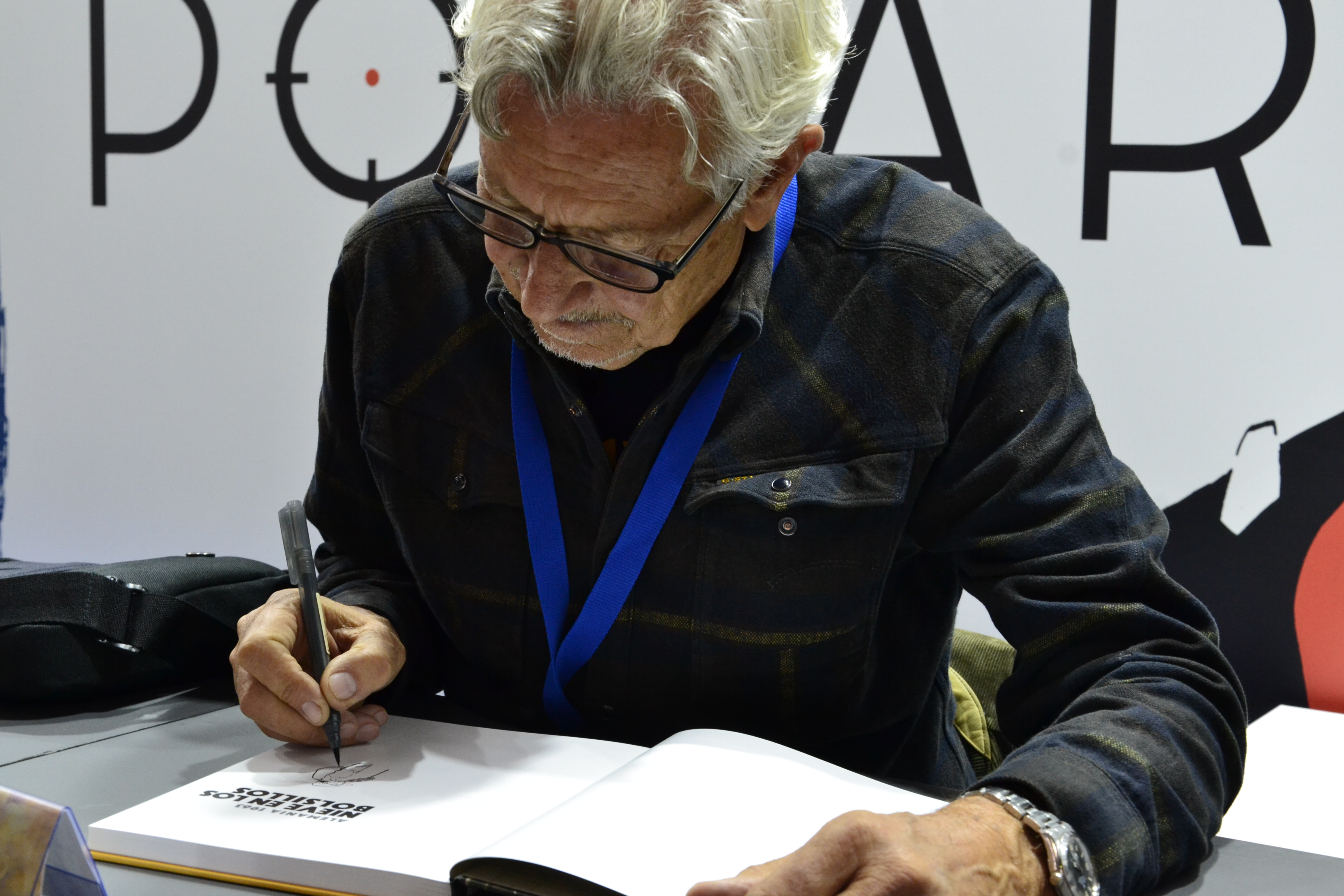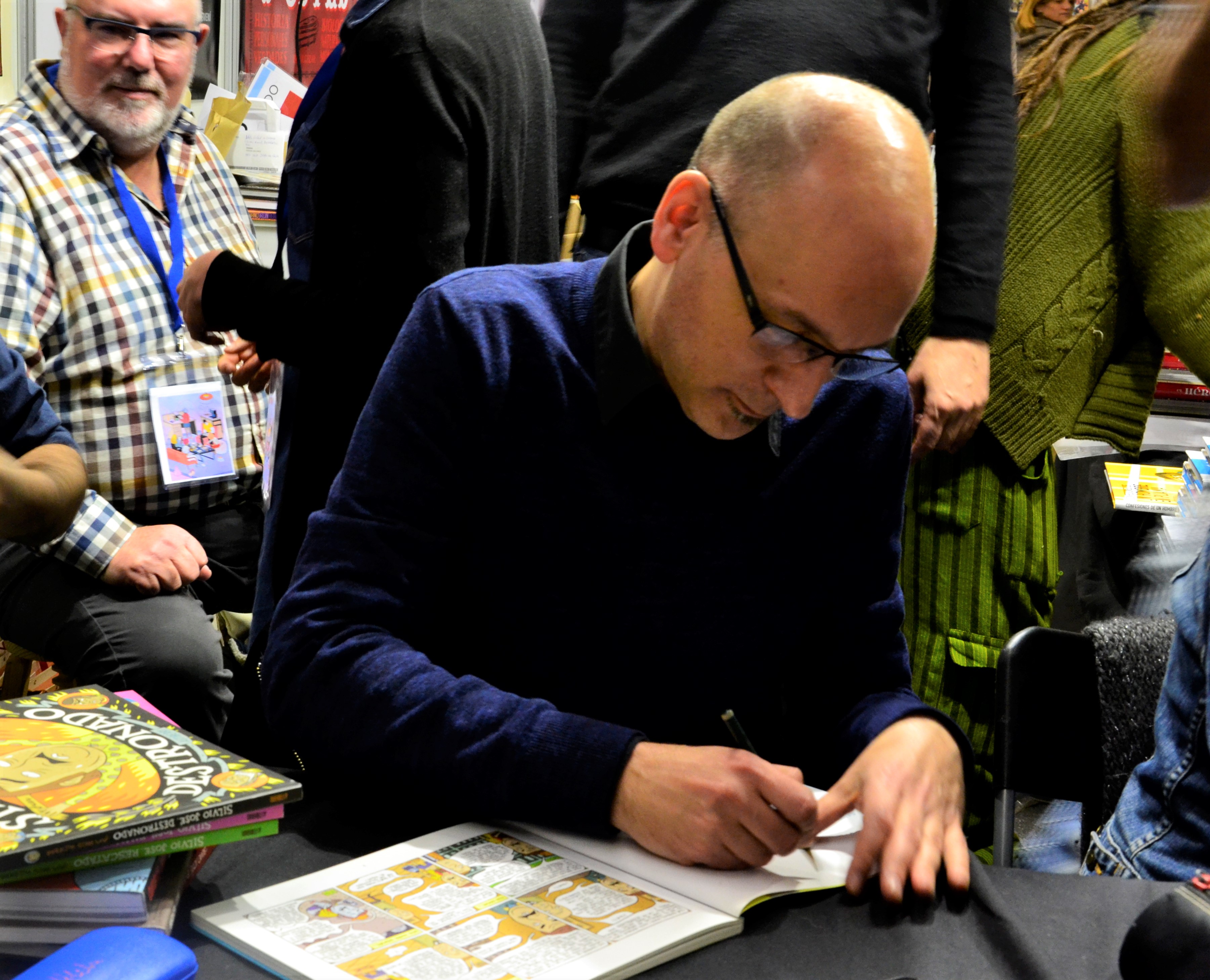 La última vez que vimos al iconoclasta Paco Alcázar fue en 2009. Entonces trabajaba todavía en El Jueves y allí nos dedicó el primer álbum dedicado a Silvio José, personaje que por entonces publicaba en el semanario de humor. Paco también tuvo a bien firmarnos sus primeros y salvajes trabajos, que son los que hicieron de Serendipia fan incondicional del gaditano. Así que tras diez años de ausencia, esperábamos toparnos de nuevo con Paco, que, ahora en Astiberri, dedicó, con tanto temple como profesionalidad, todo lo que Serendipia le llevó. Paco presentaba un nuevo trabajo, La vida y usted, un desquiciado -o no tanto-, tratado enciclopédico que en breve procuraremos reseñar como merece.