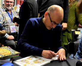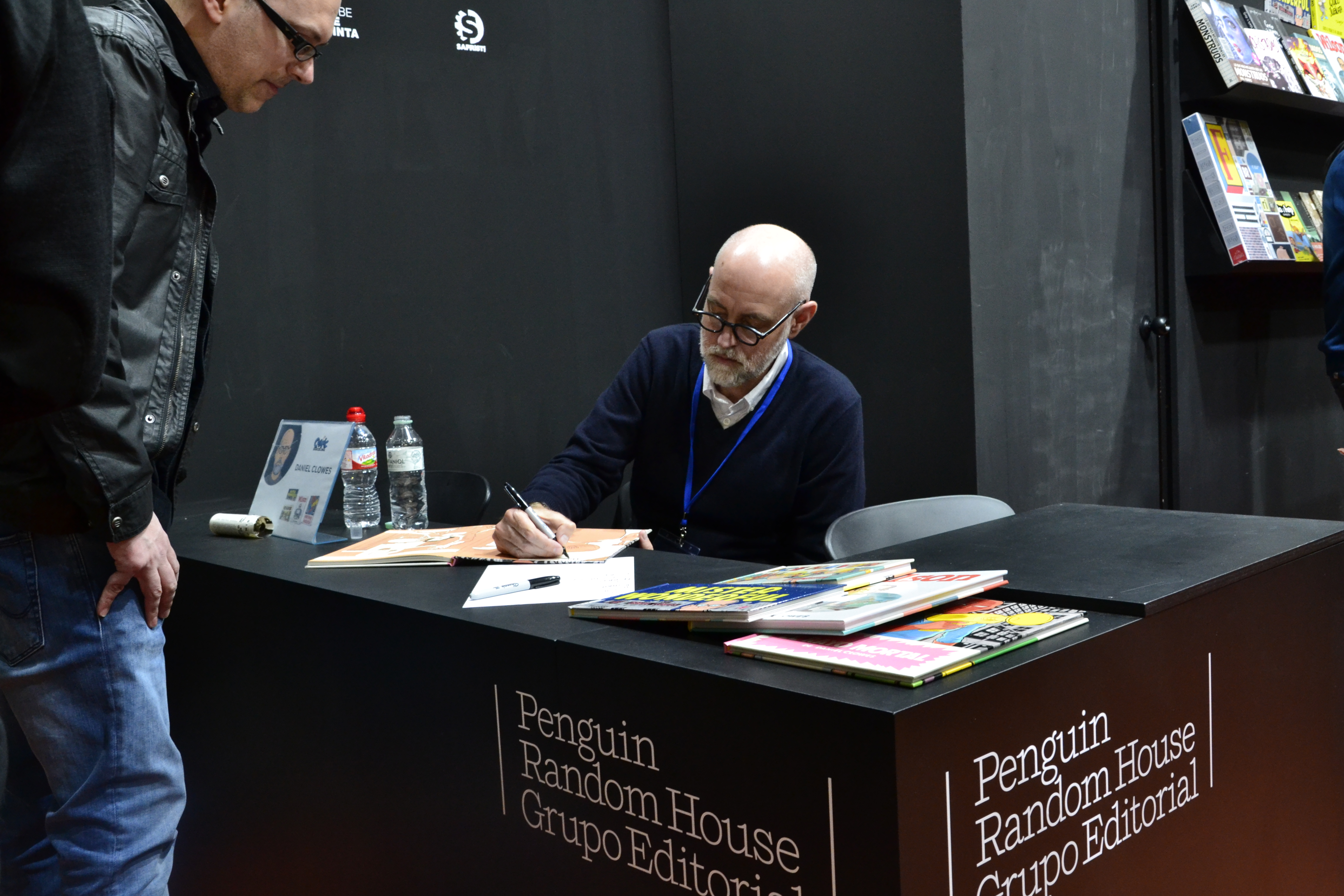 público al ser la primera vez que pisaba el certamen. Ellos han sido los que más expectativas han levantado sobre los aficionados, como demuestra el hecho de que los cincuenta números repartidos para la firma de Clowes en el stand de Random House, se agotaran en menos de media hora. Afortunadamente hubo nuevas oportunidades de obtener su dedicatoria durante los tres días del salón, pues no solo firmó en los stands de las editoriales que han publicado sus cómics, La Cúpula, Fulgencio Pimentel y la mencionada Random House, sino también en otros espacios, como en el stand de esos grandes almacenes cuyo nombre comienza por ‘f’ y termina por ‘nac’. Daniel Clowes también ofreció una clase magistral ante un entregado público.