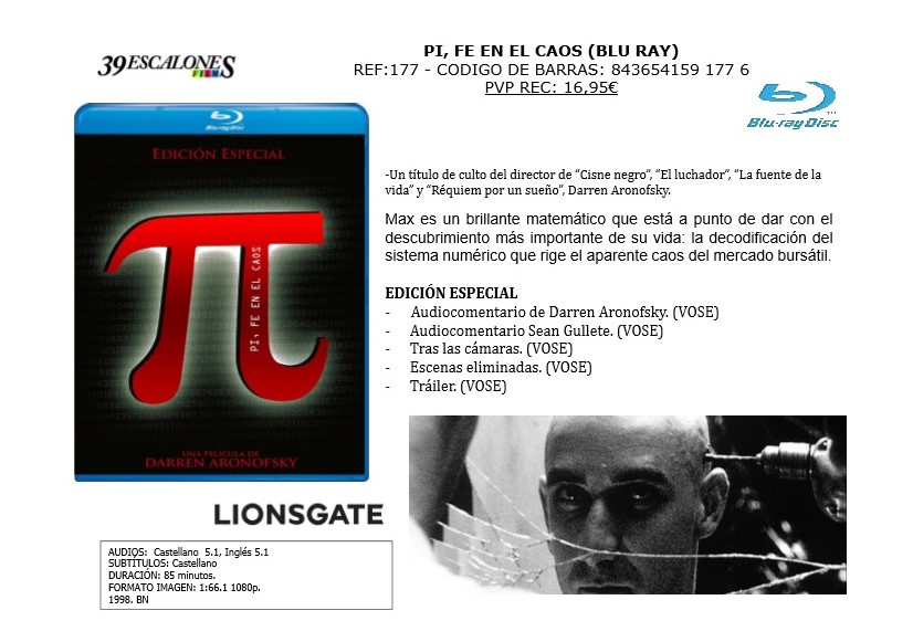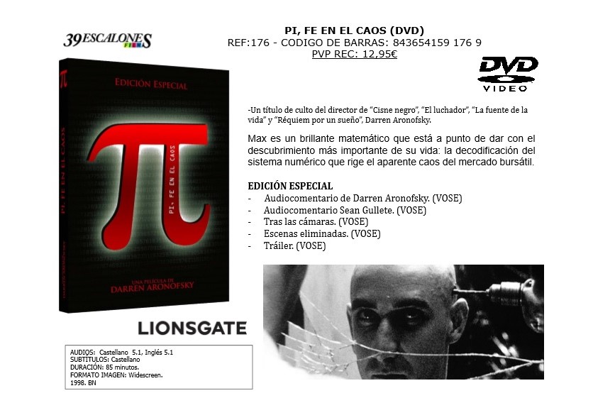 T.O: Pi: Faith in Chaos. País: USA. Año: 1998. Director: Darren Aronofsky. Guión: Darren Aronofsky. Historia: Darren Aronofsky, Sean Gullette y Eric Watson. Música: Clint Mansell. Fotografía: Matthew Libatique (blanco y negro). Productora: Harvest Filmsworks, Truth & Soul Pictures, Plantain Films, Protozoa Pictures. Formato: 16 mm. 1.66: 1. Blanco y negro. Dolby.
