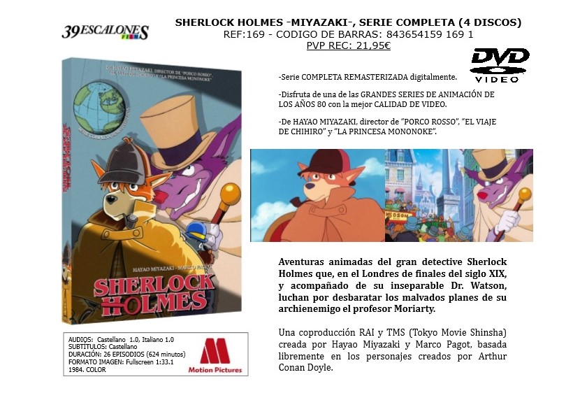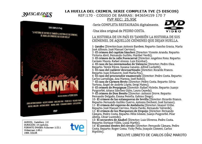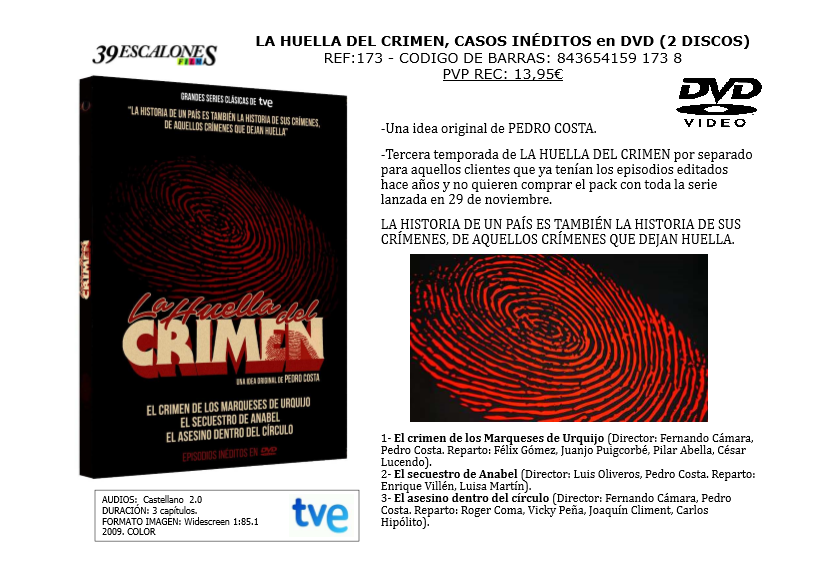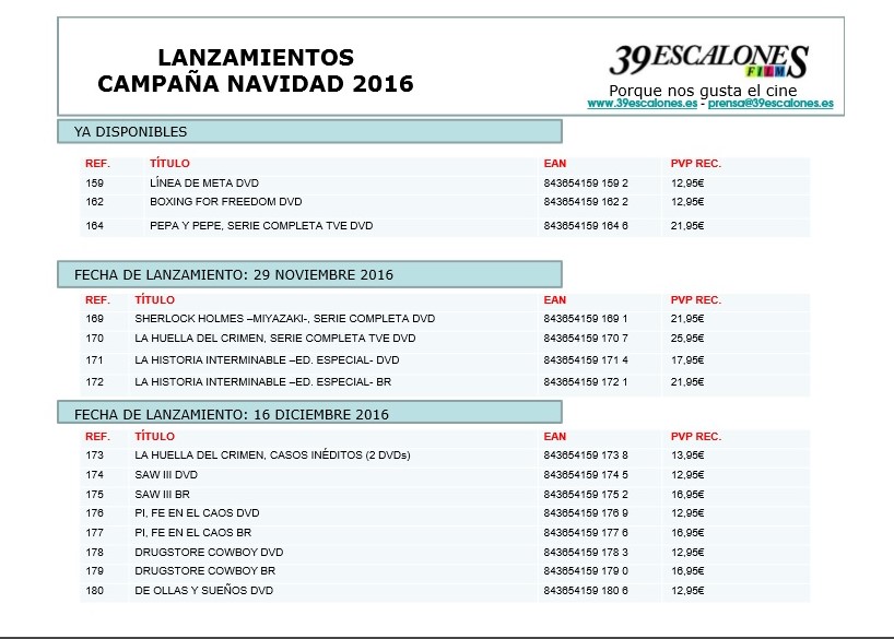 Atención a los potentes lanzamientos de 39 Escalones para este último tercio del año. Entre ellos destacamos especialmente la serie La huella del crimen, que con libreto de Carlos Díaz Maroto, se editará íntegra por primera vez en DVD. También se editarán en pack aparte los episodios que permanecieron inéditos en anteriores ediciones, así los que los tengan, podrán completar la serie sin necesidad de adquirir el pack completo. Una deferencia que 39 Escalones también tuvo con los clientes que se hicieron con el primer lanzamiento de la serie Historias para no dormir. Pero no terminan aquí las novedades de peso. Tras su retorno a los cines en edición remasterizada, La historia interminable se edita en formato DVD y Blu-ray con un magnífico diseño y textos de Jesús Palacios. También vuelve, en edición mejorada y tanto en DVD como Blu-ray, Pi, fe en el caos, la ópera prima de Darren Aronofsky; Drugstore Cowboy, de Gus Van Sant, y Saw III. Por su parte los fans de Hayao Miyakazi podrán hacerse con la serie Sherlock Holmes completa, además de otras novedades de lo más suculento, como la entrañable serie Pepa y Pepe, donde se popularizaron don jóvenes actrices españolas, María Adánez y Silvia Abascal.