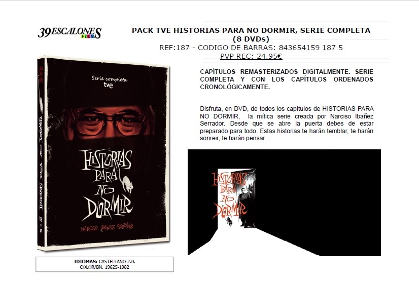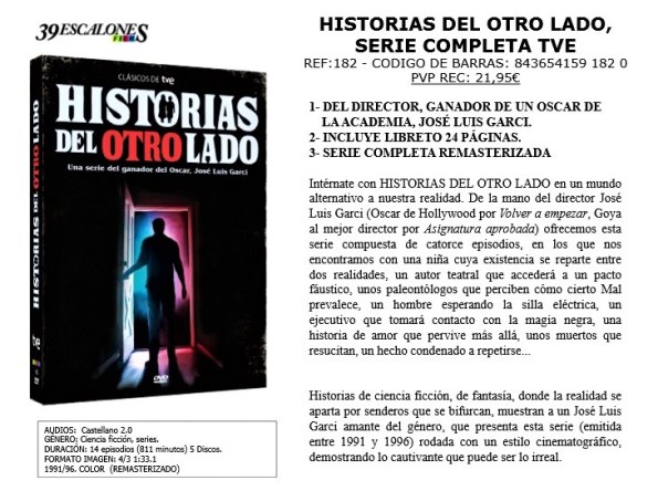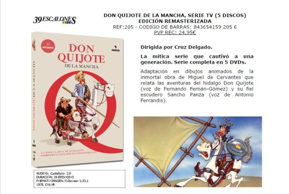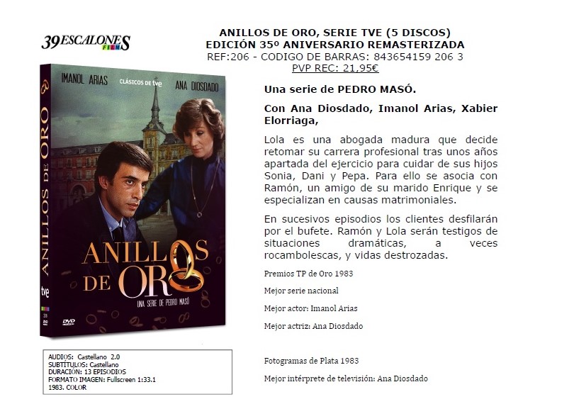 De nuevo 39 Escalones ha preparado unos suculentos lanzamientos que tienen el cine y las series españolas como principales protagonistas: Don Quijote de la Mancha de Cruz Delgado; Anillos de oro, toda una revelación en una época en la que nuestro país se preparaba para le Ley del Divorcio. Con Imanol Arias, Ana Diosdado y muchos otros actores que comenzaban a despuntar; Pepa y Pepe, magnífica serie de los noventa interpretada por Verónica Forqué y Tito Valverde en la que destacó la presencia de unas primerizas María Adánez y Silvia Abascal, además de muchos y divertidos invitados que convertían cada episodio de esta serie en una fiesta en la que los actores también participaban. De Historias para no dormir ya les hemos hablado largo y tendido y ahora se lanza con nueva presentación. Y mucho más: Parchís, Regaliz, animación y hasta Gaby, Fofó, Miliki y Fofito. Es Navidad y estas son propuestas familiares. Como La historia interminable. Pero no se confíen… pues el Hombre Alto se aproxima y en febrero nos alcanzará… Mientras tanto, disfruten de las fiestas con 39 Escalones.