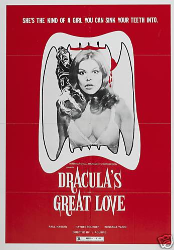 Una cartelera italiana en la que se puede apreciar el curioso nombre que se le dio en ese país a El gran amor del Conde Drácula. En la imagen Loreta en la cama a punto de ser mordida por el conde (Paul Naschy)