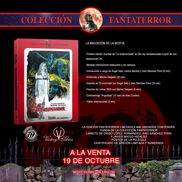 Por primera vez a nivel mundial la edición restaurada en 2k y con multitud de extras exclusivos de La endemoniada, paradigma del Fantaterror dirigido por Amando de Ossorio y protagonizada por nuestra querida Marian Salgado. La endemoniada representa, además, la entrada del director gallego en nuestra colección favorita y el 79 anuncia que espera que no se la última que se añada a la Colección Fantaterror. Esta edición también servirá para reivindicar la figura de Marian Salgado (la voz de Regan MacNeil en el doblaje original de El Exorcista, de William Friedkin) mediante esta edición, que contiene una extensa entrevista con la actriz y el magnífico corto que recientemente ha protagonizado, Angustias, de Aida Cordero.