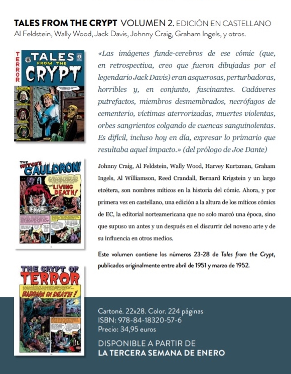 En esta segunda entrega, que reúne los números que van del 23 al 28, el lector se reencontrará con el anfitrión de la colección, The Crypt-Keeper, pero también y en divertida rivalidad, con The Old Witch (anfitriona de The Haunt of Fear) y The Vault-Keeper (invitante de The Vault of Horror). Cada cuaderno, que seguirá constando de 34 páginas, contará con cuatro historietas completas con guion de Al Feldstein, pero, muy importante, entrará en escena el magnífico Jack Davis, ilustrador que comenzará su labor en el número 23 pasando, con el siguiente, a sustituir al propio Feldstein en las labores artísticas, abriendo el resto de los números de Tales from the Crypt incluidos en el segundo tomo de Diábolo. Feldstein, además de los guiones de todas las historietas, aportará cuatro de las seis portadas, entre ellas una de las más representativas de los comics EC, la del número 24, a partir del cual, cada número se abrirá indefectiblemente con una historieta dibujada por Jack Davis, a las que se sumarán otras realizadas por los ya conocidos George Roussos, Jack Kamen, Graham Ingels, Johnny Craig o Wally Wood, este último, además, encargado de realizar las portadas de los dos números restantes. Se incorporarán al elenco de artistas Joe Orlando y Howard Larsen, manteniéndose la página dedicada a El Rincón del Guardián de la Cripta, pionero correo de los lectores, y el más bien intrascendente relato, de los cuales, además, no se señalan autorías. El maravilloso color de las portadas, que Diábolo reproduce fielmente, es obra de Marie Severin y el contenido de este segundo volumen se redondeará con un prólogo escrito por el director de cine Joe Dante, fan veterano de los comics de terror EC, que rememora como los descubrió siendo un niño.