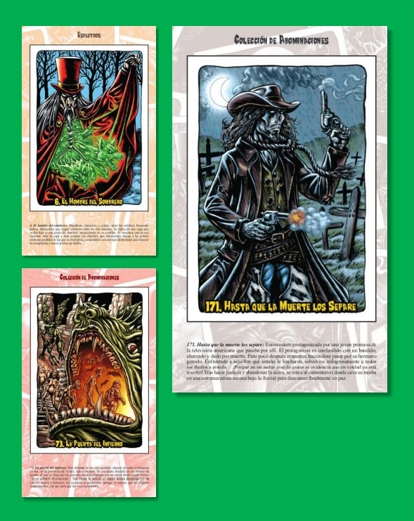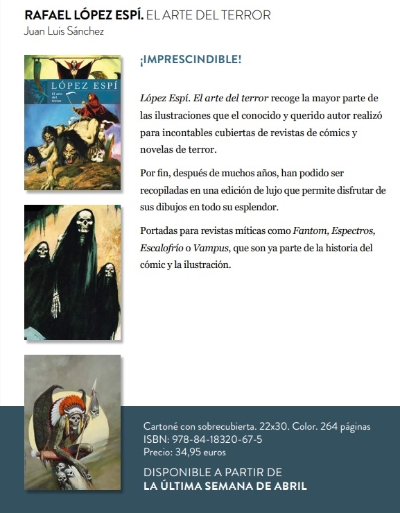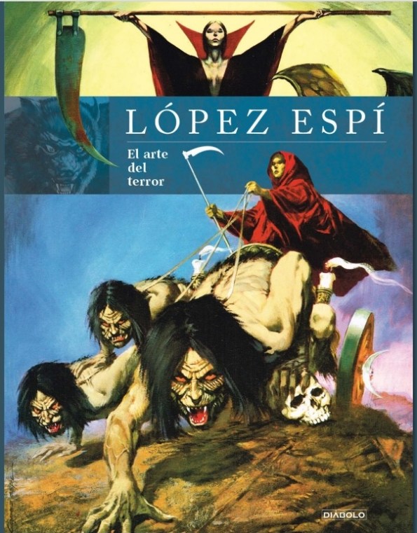 Todo este trabajo, es el que Diábolo ha reunido en López Espí. El arte del terror, un monumental volumen editado en gran formato, con tapa dura y sobrecubiertas que reproduce con mimo esas portadas en papel satinado, la extensa mayoría de ellas a tamaño natural, recuperando algunos originales y añadiendo, además, otros trabajos, quizás las grandes perlas del tomo al reproducirse a partir de los propios originales, como son las ilustraciones destinadas a editoriales extranjeras, como los espectaculares trabajos para el sello alemán Bastei, que fueron las que mantuvieron al artista ocupado durante los años ochenta y noventa. Weird West y terror gótico con una calidad que, sin duda, superaba el contenido de las novelitas a las que iban destinadas. López Espí. El arte del terror, además, se cierra con una magistral galería de monstruos que demuestra, una vez más, la inventiva del ilustrador.