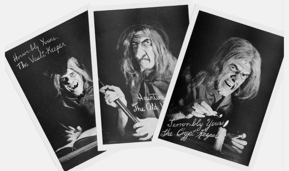 Por cierto, en El Rincón del Guardián de la Cripta de varios de los números incluidos en este tomo se habla de «una vomitiva instantánea» de 13×18 dedicada «en carne podrida y hueso» por cada uno de los tres anfitriones de los cómics EC de terror: The Crypt-Keeper, The Old Witch y The Vault Keeper, que podían adquirirse por el módico precio de 10 centavos la unidad o 25 las tres. La curiosidad nos ha podido y hemos escarbado por la web no parando hasta encontrarlas, así que reproducimos las tres imágenes y el sobre que las contenía, tal y como fueron enviadas a su afortunado poseedor hasta ahora, que ya como pura historia del cómic, han sido subastadas por una conocida firma. Cabe añadir que el modelo que posó para las tres imágenes fue Johnny Craig, con el propio Feldstein ejerciendo de maquillador.