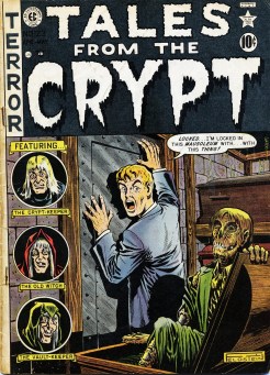 Pero todo termina, y el tomo 2 de Tales from the Crypt, también. Y no podría hacerlo mejor que con una estupenda (y terrorífica) portada de Al Feldstein que hace referencia a la primera historieta del cuaderno, Oferta mortal (Bargain in Death) en la que una perfecta jugada maestra, terminará no siéndolo. Y todo modélicamente ilustrado por el ya imprescindible Jack Davis. Un largo trance (Ants in her Trance), ilustrada por Joe Orlando, llevará hasta el lector los efluvios corruptos de ultratumba. Orlando, por cierto, es el protagonista de una nota biográfica incluida en ese número. Y es que otra de las muchas innovaciones que EC Comics ofreció, fue la de poner cara a sus artistas y acercarlos a los lectores. Una historia sentimental (A-Corny Story) está realizada por Jack Kamen y su argumento gira entorno a la búsqueda de la eterna juventud ¡Y vaya si la consigue el protagonista! Y cierra «Ghastly» Ingels con una historieta protagonizada por uno de los más terroríficos arquetipos del terror ¿hombres lobo?, ¿vampiros?… ¡No! El muñeco de ventrílocuo (The Ventriloquist’s Dummy) ¡Nada hay más que añadir!