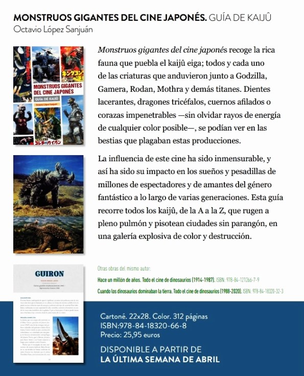 Cine, mucho cine. Cómic, mucho cómic. Y pop, mucho pop en las novedades de Diábolo para este mes de abril. Cine con ‘Monstruos gigantes del cine japonés‘, una guía de campo realizada por el especialista Octavio López Sanjuán con todo el bestiario del keiju eiga; Cómic, en este caso ilustraciones de portada, de aquello cómics Vértice de terror que tan buen olor hacían (Fantom, Espectros…) y tan buen sabor nos dejaron a los aficionados en ‘López Espí. El arte del terror‘, un tomo que ofrece una amplia muestra de aquellas portadas de los años setenta, posiblemente las mejores que realizó el artista para Vértice; seguimos con el terror y el cómic con ‘Voodoo‘, la novena entrega de la ‘Biblioteca de cómics de terror de los años 50’ y que en esta ocasión ofrece al lector los seis primeros números de la mítica y terrorífica colección, posiblemente la mejor tras los EC Comics. Y finalmente dos reediciones: prosiguiendo con el cine y el terror, ‘¡Vamos a morir todos!‘ de Pedro Delgado Cavilla y la reedición ampliada, de ‘Antes de mi vecino Miyazaki‘, una nueva visita a los Estudios Ghibli de la mano de los especialistas Álvaro López Martín y Marta García Villar. Y… se acerca Cómic Barcelona…