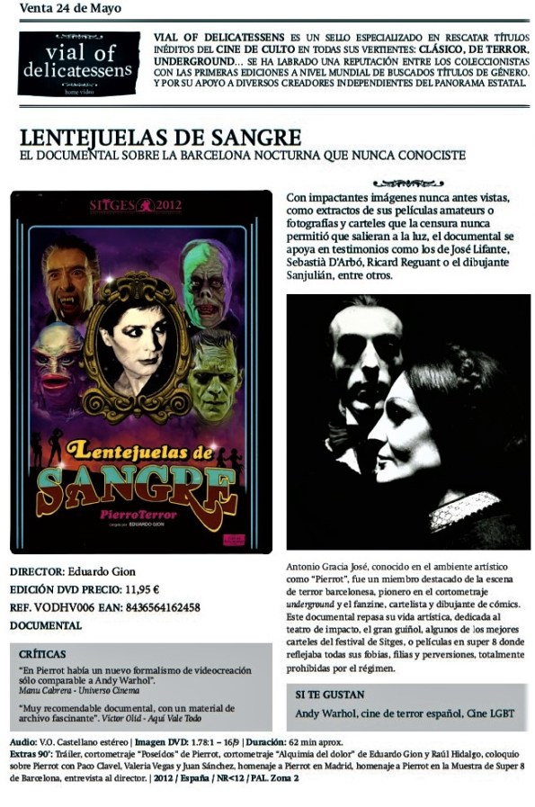 Por otro lado, continuando con la colección “Etiqueta Negra” destinada a albergar de manera artesanal y rudimentaria lo más granado del cortometraje underground internacional “Vial of Delicatessens” lanza en edición limitada, dos nuevas referencias. Ambos DVDs se lanzan con un P.V.P de 4, 00 € + 2 euros de gastos de manipulación y envío.: