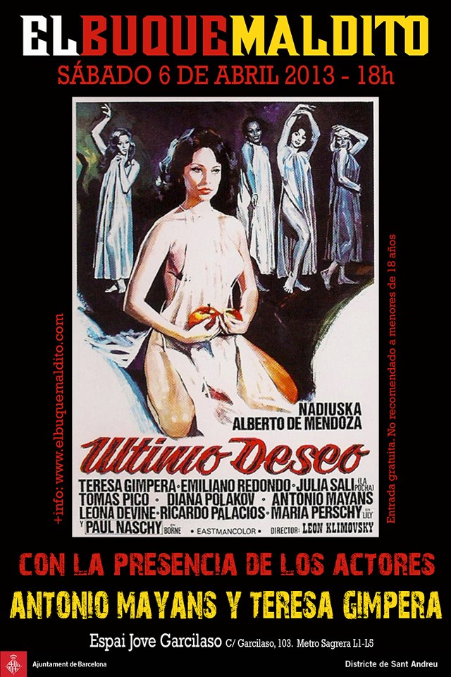 El Buque Maldito nos ofrece una rareza del cine fantástico español, Último deseo (1976) de León Klimovsky, que contará con la presencia de dos de sus protagonistas, Teresa Gimpera y Antonio Mayans.