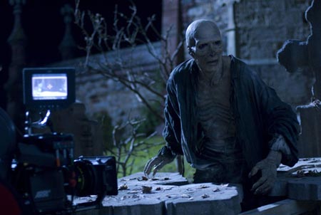 resucita en el cementerio español con la cuenca del ojo repleto de gusanos. Cosa que nos deja ver momentos antes de abalanzarse al cuello de la perpleja actriz de turno y hacerle un estropicio.