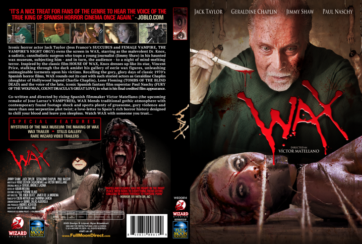 Full Moon/Wizad Studios lanza Wax como «una película imprescindible para entender el horror español«, ya que «combina una atmósfera gótica tradicional con el toque contemporáneo del found footage, violencia sangrienta y un giro final inesperado«. La compañía destaca el hecho de que actores legendarios del género como Jack Taylor («La novena puerta»), Geraldine Chaplin («El hombre lobo»), Lone Fleming («La noche del terror ciego») o el propio astro del terror Paul Naschy, quien presta su voz a un autómata, desfilen a lo largo de un inquietante metraje que homenajea al terror de todos los tiempos.