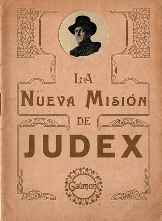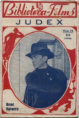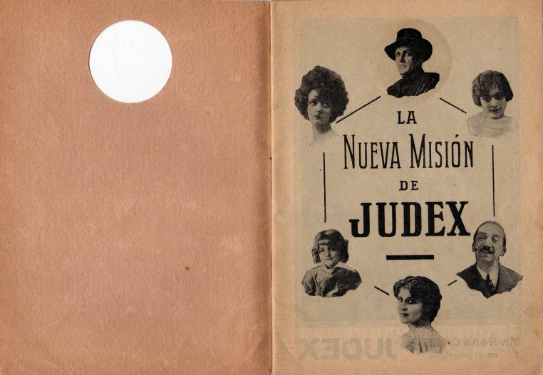 Se realizaron dos seriales interpretados por el mismo actor, René Cresté en el papel protagonista, además de la popular Musidora (los ojos despiertos encontrarán una referencia a esta misteriosa actriz en la última peli de Tarantino, en la cabina de proyección del cine). El primer serial, Judex, se rodó en 1917 siendo seguido al año siguiente por La nueva misión de Judex (La Nouvelle Mission de Judex) constando ambas series de doce episodios y compartiendo casi la totalidad de los actores. Ignoro si se estreno Judex en España, ya que no he visto ningún programa, pero de La nueva mísión de Judex, la distribuidor Gaumont editó un programa libreto de 48 páginas con la novelización total del argumento, ilustrado con numerosas imágenes de la serie, además de una portada con un pequeño troquel circular. Virguerias…