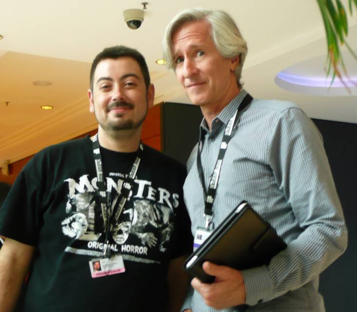 Nos desalojaron rápidamente de la sala de prensa, ya que a continuación le tocaba el turno a la rueda de prensa de Let me in, que contaría con el director y el protagonista masculino Kodi Smith-McPhee, aunque, ante nuestra desilusión, Chloe se había escaqueado y no se presentó. Pero yo no me quedé sin abordar a Matt Reeves para seguir incrementando mi libreta de autógrafos y a Pirie con mi ejemplar de El vampiro en el cine para que me lo dedicara.