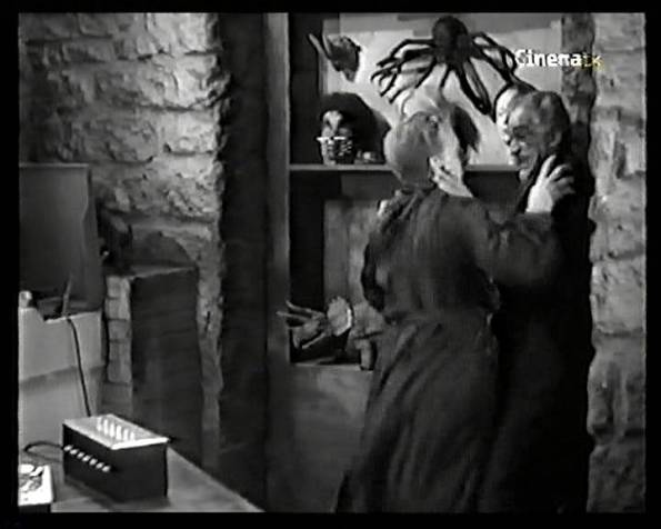 Bien, aquí tenemos a Karloff y Kyser luchando, mientras Lugosi está en el suelo. Fíjense en la estanteria de la derecha. En el segundo estante se puede ver el triceratops.