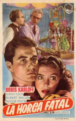 En La horca fatal (The Man They Could Not Hang, 1939), la única de las cinco que se estrena en nuestras pantallas y armado con un vistoso peluquín, como Dr. Henryk Savaard crea un corazón artificial con el que mantener un cuerpo vivo pero en pausa, para poder repararlo reactivándolo posteriormente. Una loable idea si no fuera que le lleva a experimentar con un sujeto que termina muriendo. Condenado a muerte y ahorcado, su socio lo revive utilizando su técnica, cuya eficacia queda así probada, buscando vengarse de los seis jurados que lo condenaron.