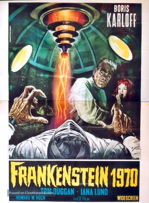 personaje que lo encumbró en Frankenstein 1970 (Howard W. Kotch), película de engañoso título, pues ni fue realizada ni estrenada ese año, sino en 1958, y en la que Karloff encarna al último de los Frankenstein. Una disfrutable película que nos cuenta como el anciano y rijoso heredero, de prolongada carcajada y aficionado a tocar tétricas melodías con el órgano, arruinado, alquila su castillo a un equipo de televisión para que ruede un programa sobre su antecesor, y así, poder adquirir nuevo instrumental atómico con el que dar la vida a la criatura más fea que la franquicia ha ofrecido, con todo el cuerpo vendado y una cabeza inexplicablemente grande. Mucho mejor resultó Corridors of Blood (Robert Day, 1958) cinta en la que como Dr. Bolton inventa la anestesia, investigación que le llevará a experimentar consigo mismo convirtiéndose en un adicto, pues la fórmula contiene derivados del opio. Esto le llevará a frecuentar los bajos fondos y ejercer malas praxis al mezclarse con pésimas compañías para que le faciliten su dosis. Una de las mejores actuaciones de Karloff en un atmosférico filme que tiene entre sus atractivos el de contar también con Christopher Lee encarnando al vil asesino Resurrection Joe.