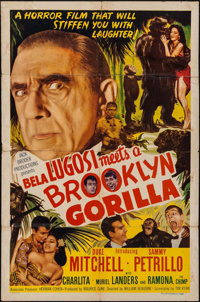 estrictamente alimenticio en el que Lugosi interpreta a un personaje conocido como el vampiro, que no es otra cosa que un científico loco que busca dominar el mundo obteniendo unas reservas de uranio con la ayuda de un robot, hasta que se cruza una anciana irlandesa en su camino desbaratando sus planes. Para mayor humillación de Lugosi, la cinta llegó a exhibirse en Estados Unidos, aunque al menos con un bello nombre, Vampire Over London. Pero no finalizarían aquí las humillaciones para el veterano actor: de vuelta a casa le esperaba un subproducto que se ha convertido, merecidamente, en pieza de culto: Bela Lugosi Meets a Brooklyn Gorilla (1952) película perpetrada por William Beaudine en tan solo nueve días en la que Lugosi, como Dr. Zabor y desde su laboratorio de la isla Kola-Kola, crea un suero que convierte a los hombre en gorila. Allí irán a perturbar la paz dos imitadores de Dean Martin y Jerry Lewis: Duke Mitchell y Sammy Petrillo que, uno con sus inaguantables canciones, en especial la repetitiva Deed I do, y el otro con sus muecas, causarán la más insufrible vergüenza ajena al espectador. Aún así las críticas fueron positivas: mientras Variety destacaba sus títulos de crédito (¿?), Box Office la recomendaba para “arrancar algunas risas a los espectadores de pueblo”.