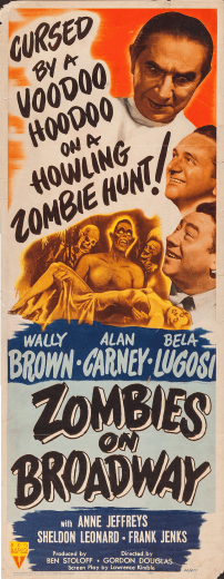 difiere mucho de los subproductos comentados, Zombies on Broadway (Gordon Douglas, 1945) que parodia la obra maestra de Jacques Tourneur, I Walked with a Zombie (1943) utilizando los mismos escenarios y dos de sus actores: Darby Jones, el inolvidable Carrefour, y Sir Lancelot, el inaguantable cantante de Calypso. A esto sumaron a Bela Lugosi como Dr. Reanault, inventor de un fluido zombie, y unos cómicos de tercera regional que hacían buenos a Abbott y Costello.